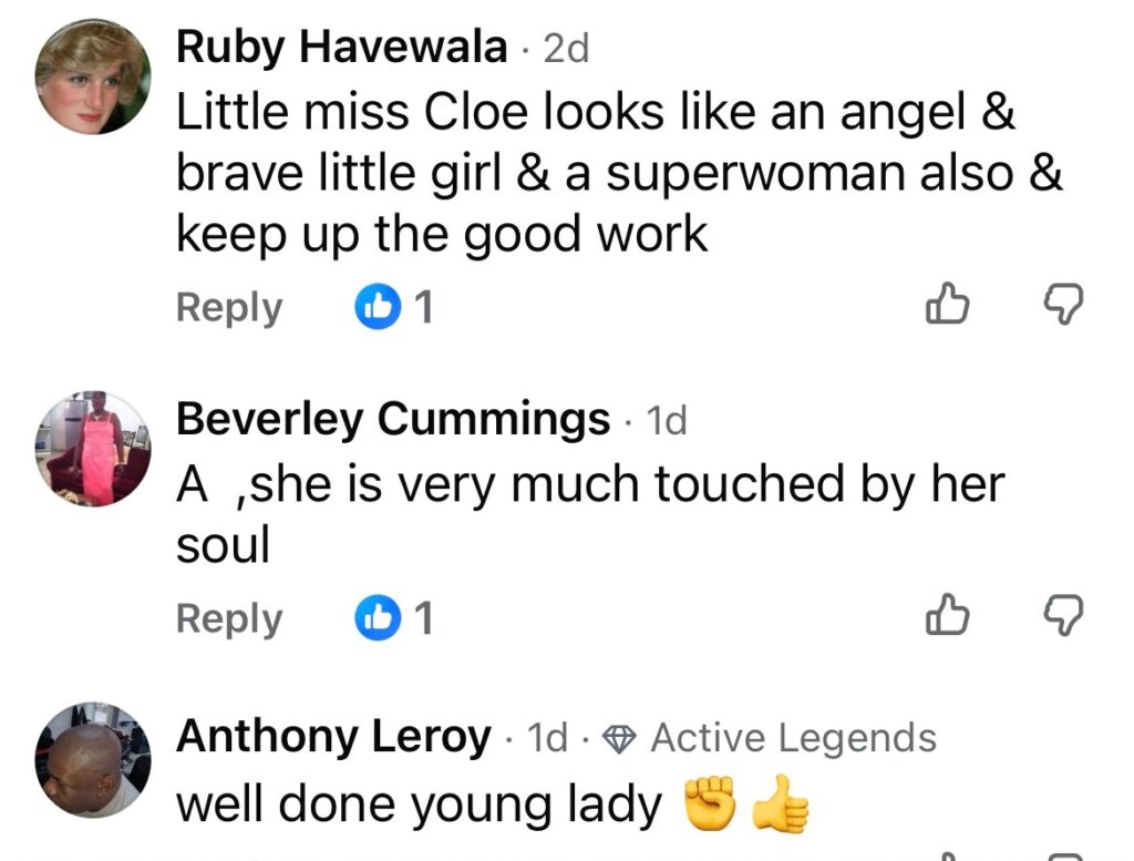 “Little miss Cloe looks like an angel & brave little girl & a superwoman also & keep up the good work”