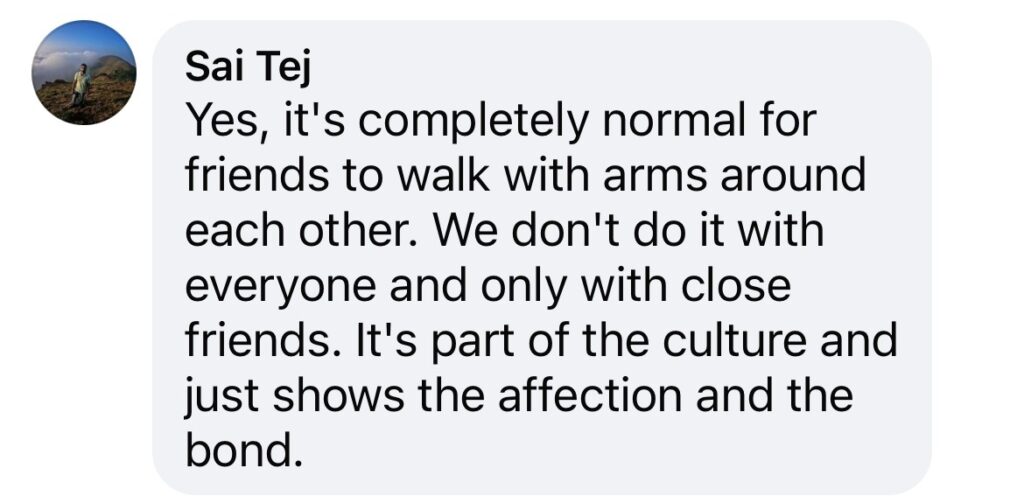 • Many explained that in India and other regions, physical affection between male friends is normal, platonic, and culturally accepted.