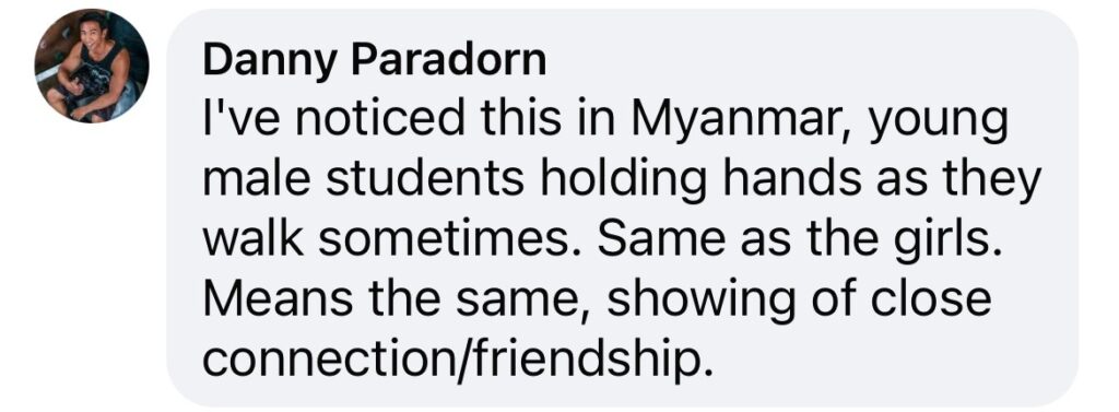 He shared similar observations from Myanmar, noting that young men and women alike express friendship through touch. His comment reinforced how common and unremarkable the behavior is in many societies.