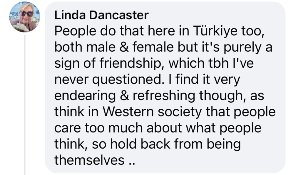 Sharing observations from Türkiye, she described public displays of friendship as endearing and freeing. Her comment contrasted openness with Western restraint, without criticism.