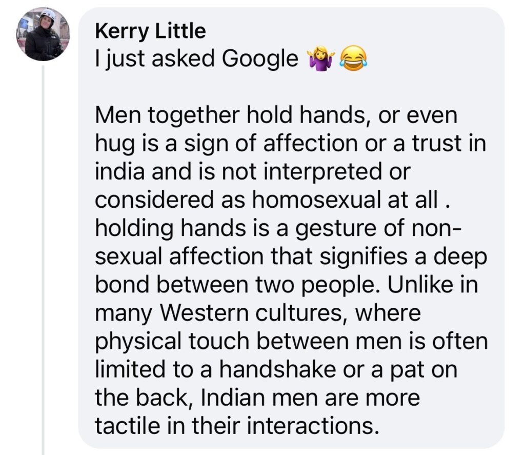 When Ste Lacey asked a question in a Facebook group “Why do Indian men walk hand in hand and put their arms around each other? Am I right in thinking they are gay?” he framed it as a genuine cultural inquiry, asking for understanding before assumptions took hold.