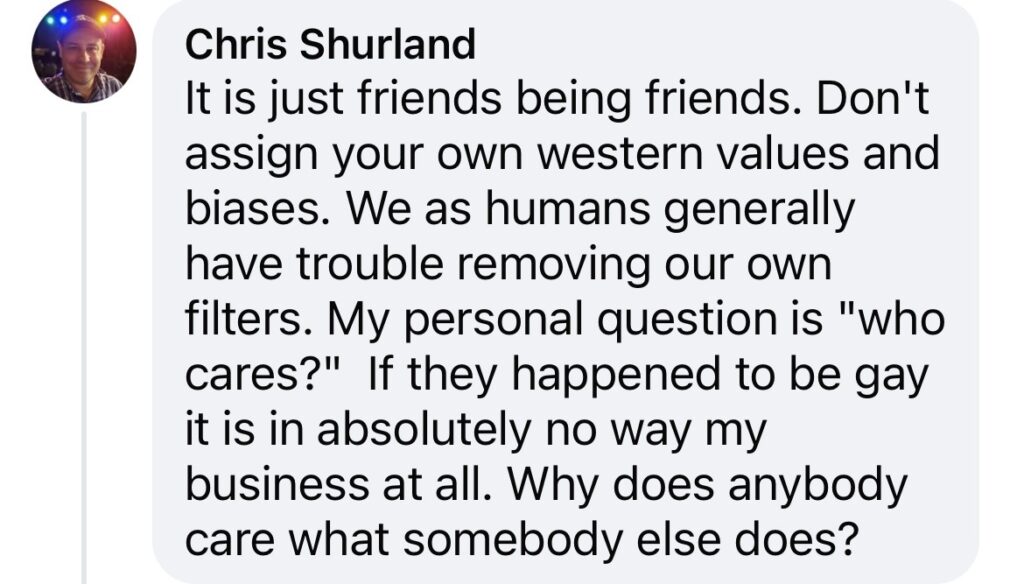 He encouraged readers not to impose Western assumptions on other cultures, gently reminding everyone that personal biases shape perception. His closing thought — questioning why anyone should care about someone else’s sexuality — was framed with empathy, not attack.