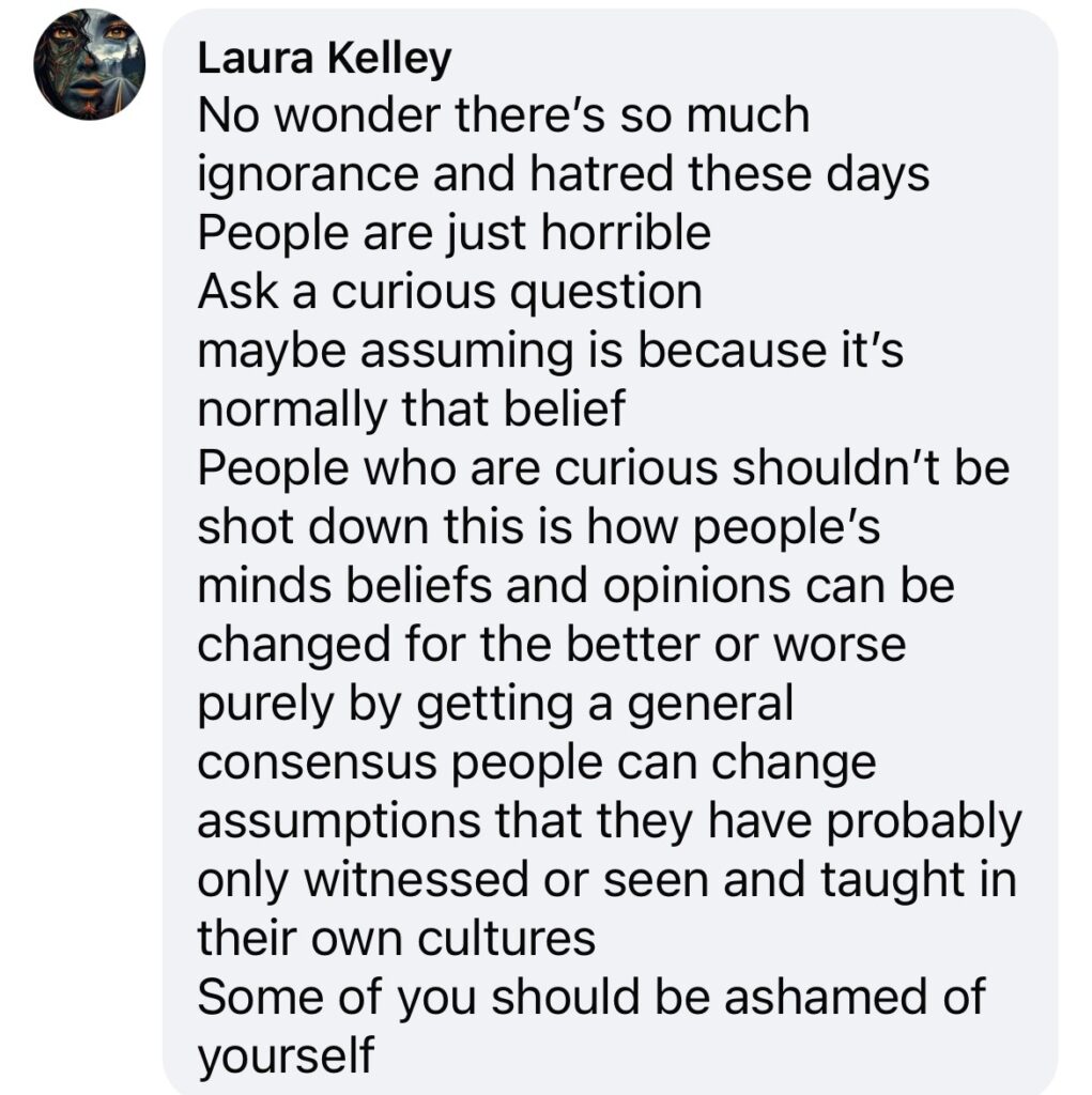 She spoke directly to the spirit of the thread, defending curiosity itself. Her comment emphasized that respectful questions are how ignorance turns into understanding, and that kindness in response matters.
