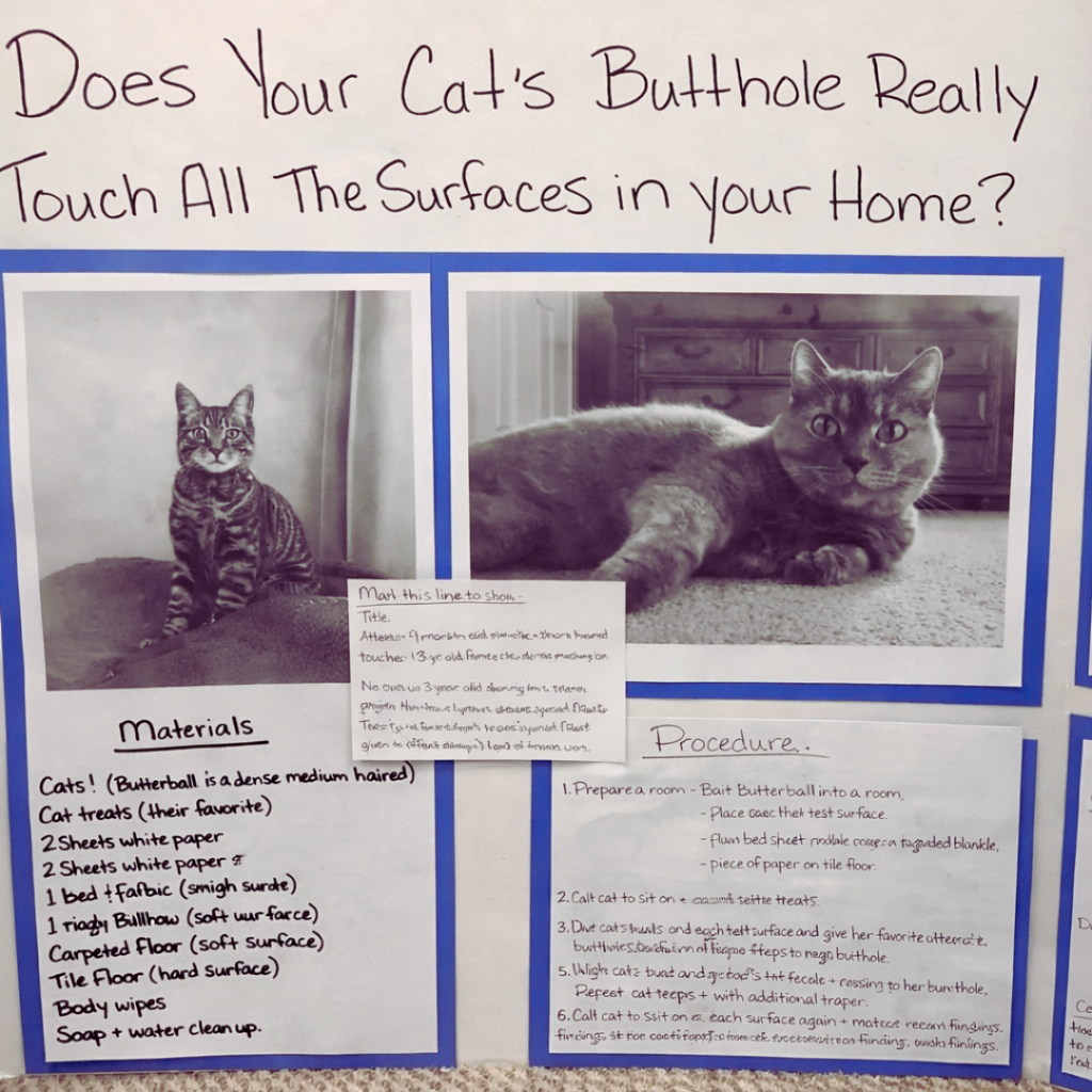 To find out whether cats make contact with household surfaces when they sit, Kaeden used a clever technique.