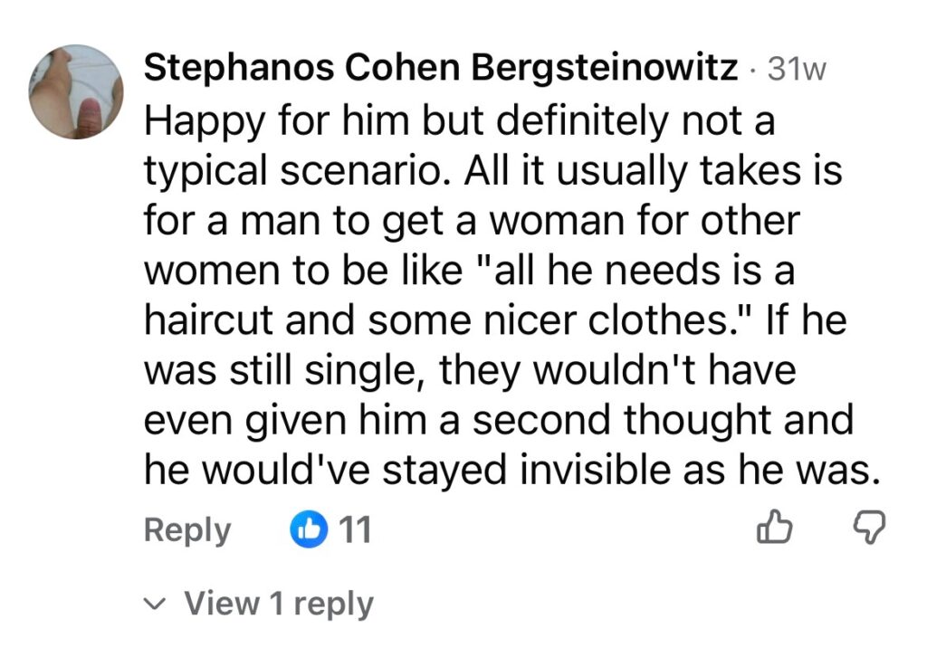 “Happy for him but definitely not a typical scenario… If he was still single, they wouldn’t have given him a second thought and he would’ve stayed invisible.”