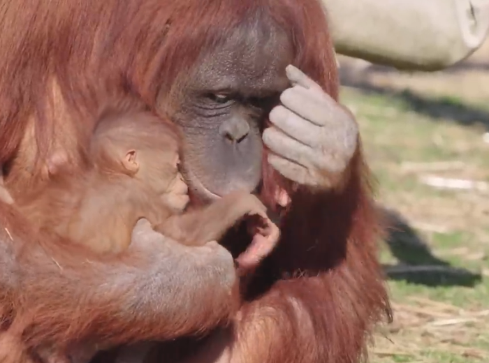 - The orangutan successfully nursed her infant after observing the behavior