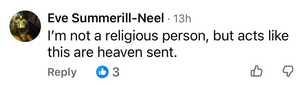 “I’m not a religious person, but acts like this are heaven sent.”