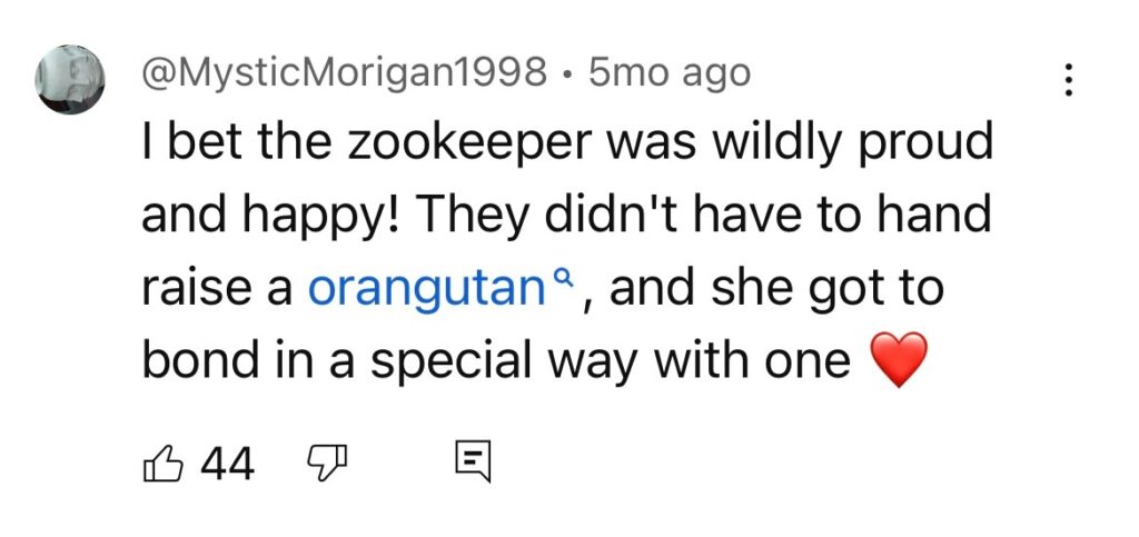 Orangutans share approximately 97% of their DNA with humans and are known for their advanced cognitive abilities, including imitation and problem-solving. After watching the caretaker, the orangutan adjusted her behavior and successfully latched her baby, allowing natural feeding to begin.