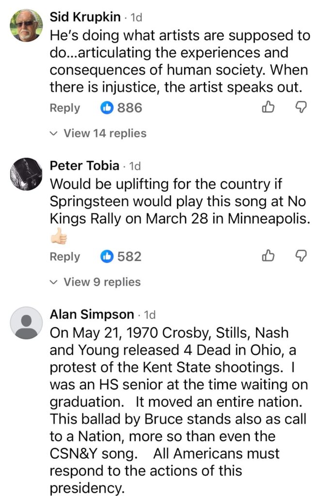 “Would be uplifting for the country if Springsteen would play this at No Kings Rally on March 28 in Minneapolis.”