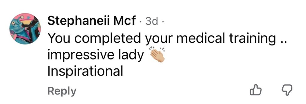 “You completed your medical training, impressive,” wrote Stephaneli McF, while others simply called her “a champion” and “an amazing woman.”