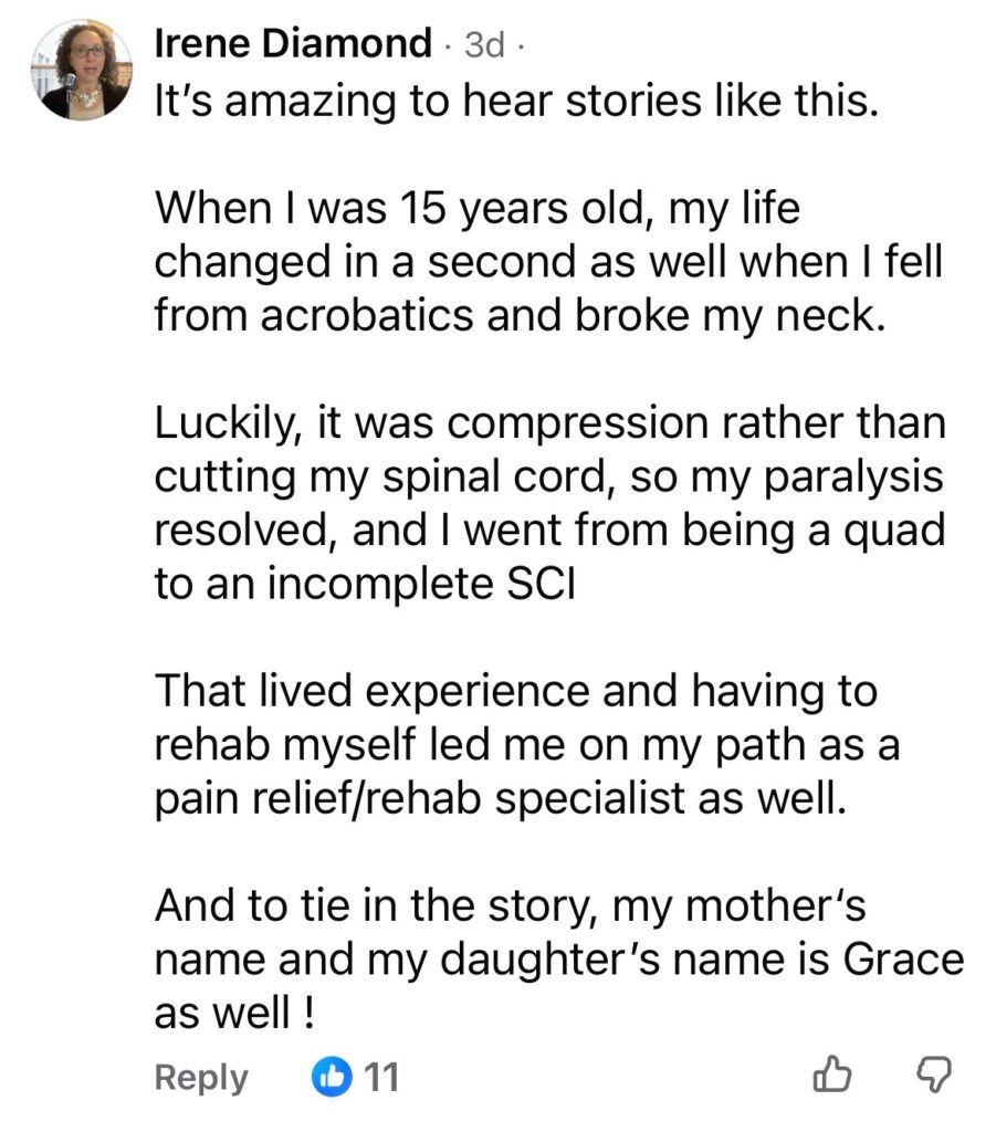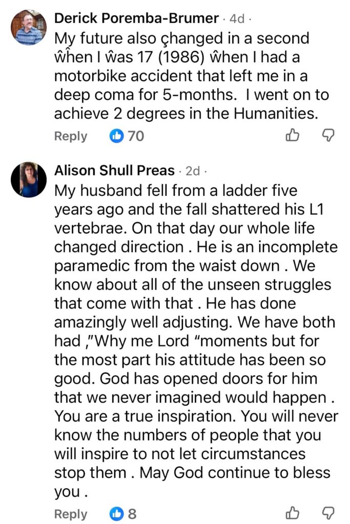 One commenter, Derick Poremba-Brumer, shared how his own life changed in seconds after a motorcycle accident at 17 that left him in a five-month coma. Despite everything, he went on to earn two humanities degrees, a reminder that altered bodies do not erase intellectual or emotional growth.