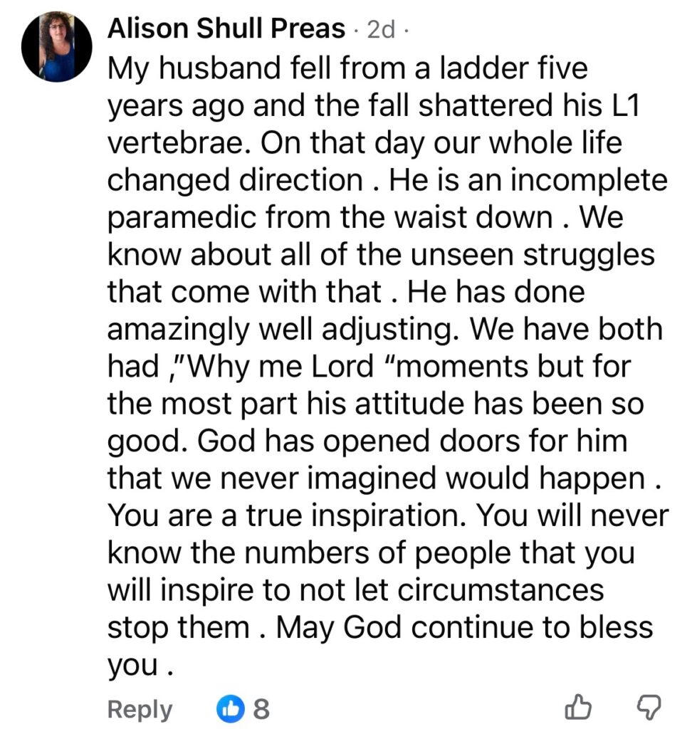 Alison Shull Preas shared that her husband shattered his L1 vertebrae after falling from a ladder, changing the course of their lives overnight. She spoke of the unseen struggles, but also of doors opening in ways they never expected.