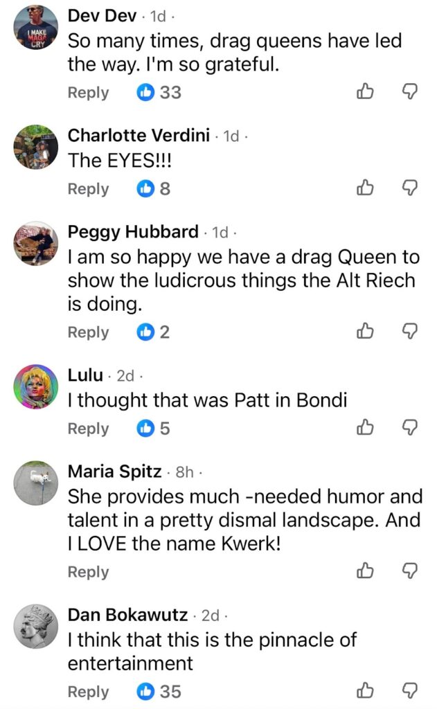 Whether people view it as satire, humor, or protest art, the videos have sparked wide discussion about drag as an art form, political expression, and how comedy can intersect with current events and cultural expectations. Eric Qwerk’s staging, dramatic, eye-catching, and sharply exaggerated, is a potent reminder that drag has always been a space for commentary, identity play, and pushing boundaries.