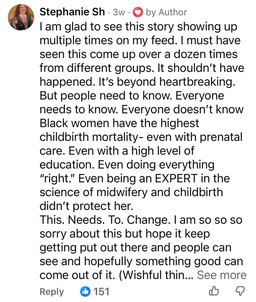 The American College of Nurse-Midwives (ACNM) echoed this sentiment in a statement shared on Facebook, calling her death a “profound failure of the systems meant to protect birthing people,” and pledging renewed action to dismantle racial inequities in maternal care.