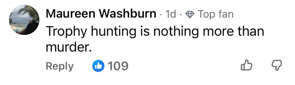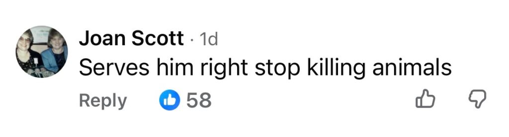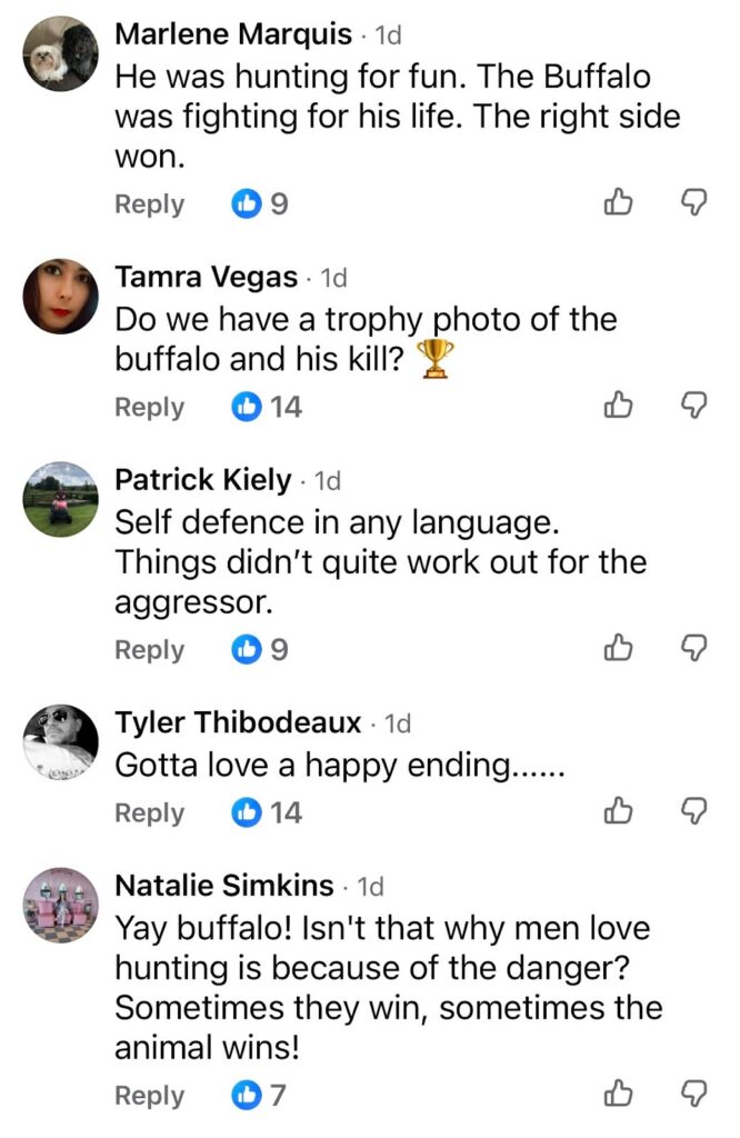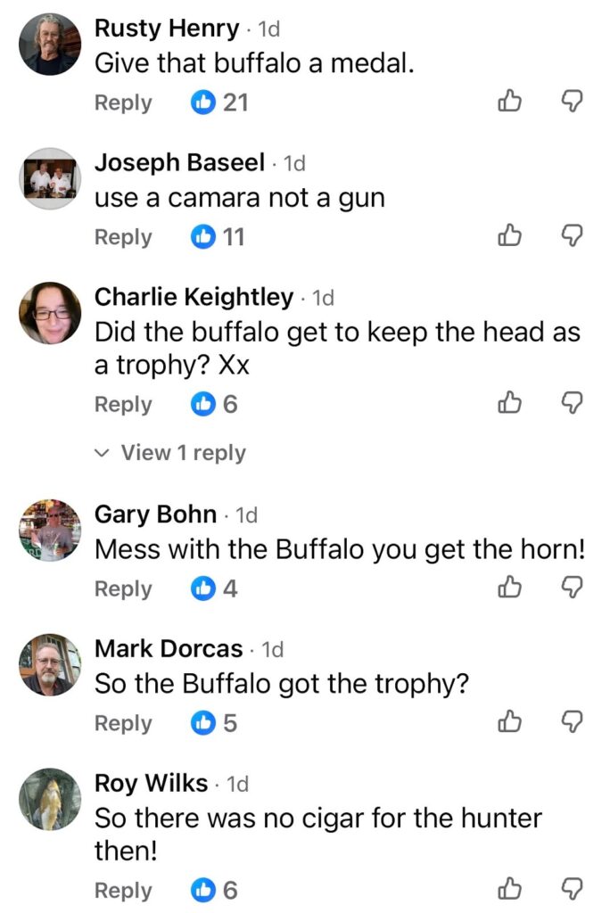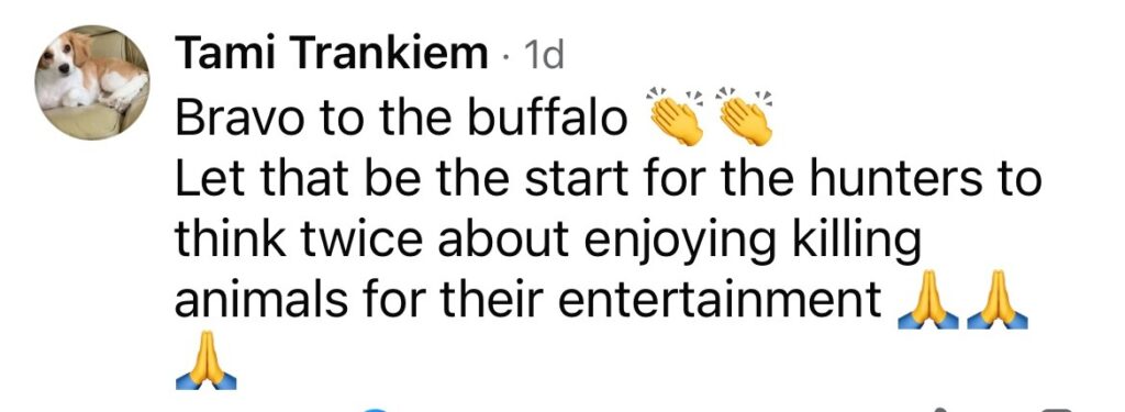 “Bravo to the buffalo. Let that be the start for the hunters to think twice about enjoying killing animals for their entertainment.”