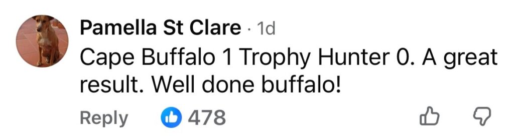 “Cape Buffalo 1 Trophy Hunter 0. A great result. Well done buffalo!”