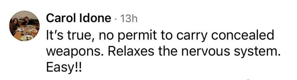 It’s true, no permit to carry concealed weapons. Relaxes the nervous system. Easy!!