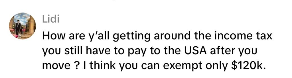 How are y’all getting around the income tax you still have to pay to the USA after you move? I think you can exempt only $120k.