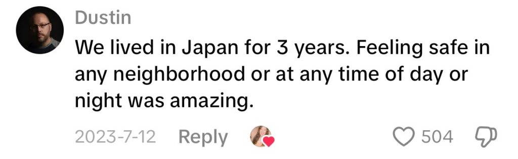 We lived in Japan for 3 years. Feeling safe in any neighborhood at any time of day or night was amazing.