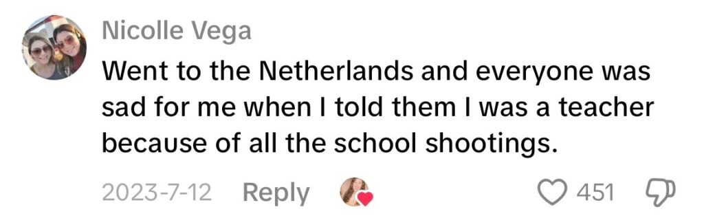 Went to the Netherlands and everyone was sad for me when I told them I was a teacher because of all the school shootings.
