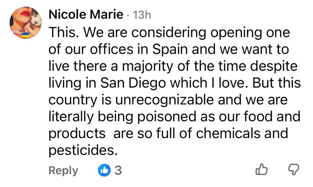 We are considering opening one of our offices in Spain and want to live there most of the time despite loving San Diego. This country is unrecognizable and we are literally being poisoned as our food and products are full of chemicals and pesticides.